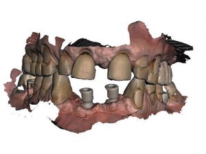 The second phase consists of installing a scanbody on the previously installed implants of the patient and taking impressions (the impression can be taken with the transfer) of the arch to create a provisional bridge supported by 2 implants, taking into account the removal of the lower incisors.